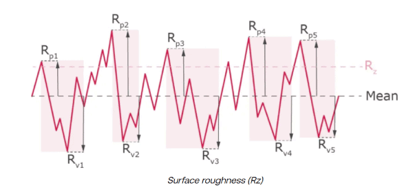Rz – The average of consecutive highest peaks and lowest valleys. Vertical distance between the highest peak and lowest valley, the distance of the second highest peak and the second-lowest valley, etc. This is usually done for the five biggest deviations, and then an average is calculated.